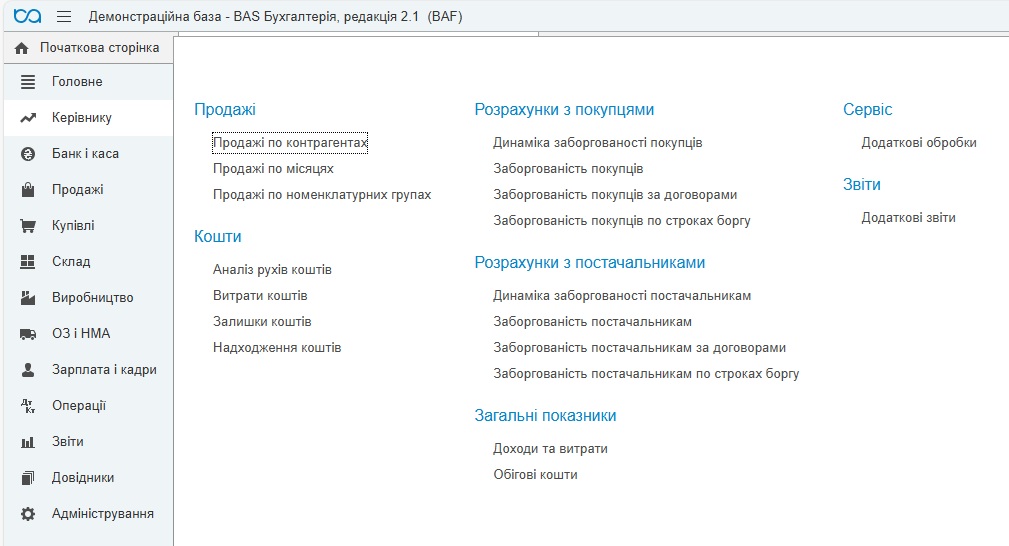 "BAS Бухгалтерія" надає користувачеві набір стандартних звітів, які дозволяють аналізувати дані залишків, оборотів рахунків і проводок у найрізноманітніших розрізах. Серед них оборотно-сальдова відомість, шахова відомість, оборотно-сальдова відомість по рахунку, обороти рахунку, картка рахунку, аналіз рахунку, аналіз субконто, обороти між субконто, зведені проводки, головна книга, діаграма.