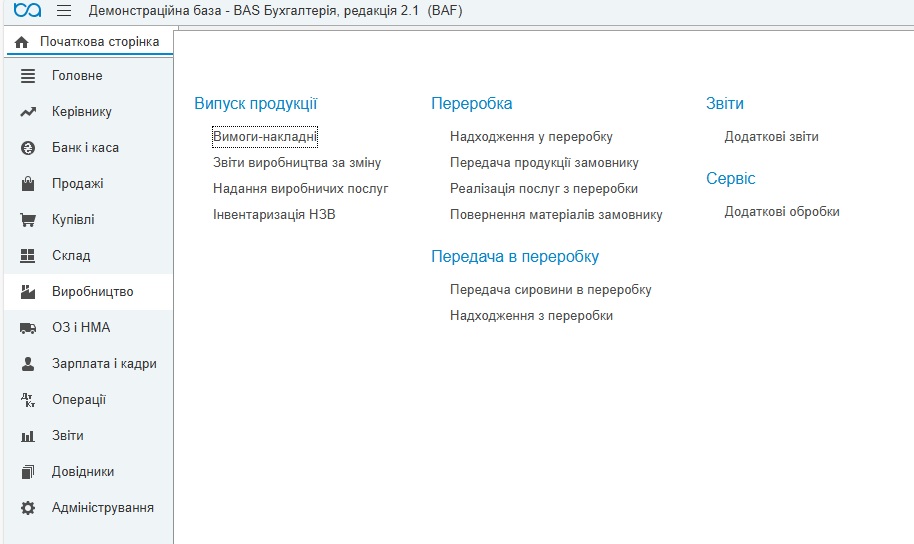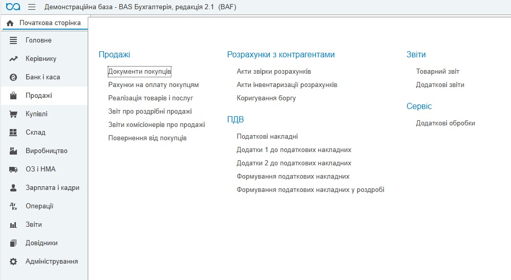 Програмний продукт "BAS Бухгалтерія" призначений для автоматизації бухгалтерського і податкового обліку, зокрема й підготовки обов'язкової (регламентованої) звітності, в організаціях, що здійснюють будь-які види комерційної діяльності: гуртову і роздрібну торгівлю, комісійну торгівлю (включно з субкомісією), надання послуг, виробництво тощо. Бухгалтерський та податковий облік ведеться відповідно до чинного законодавства України.