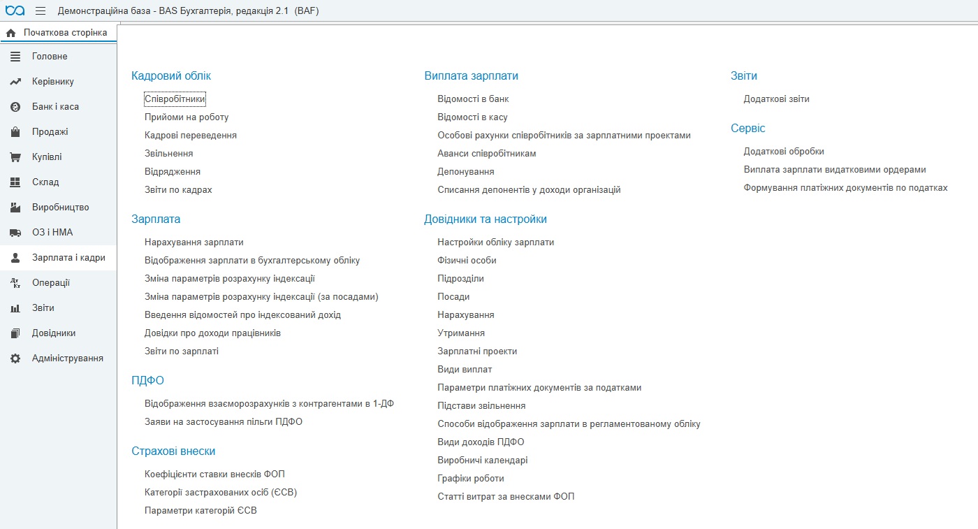 В "BAS Бухгалтерії" ведеться облік руху персоналу, включаючи облік співробітників за основним місцем роботи і за сумісництвом, зокрема внутрішнім. Забезпечується формування типових форм за трудовим законодавством.